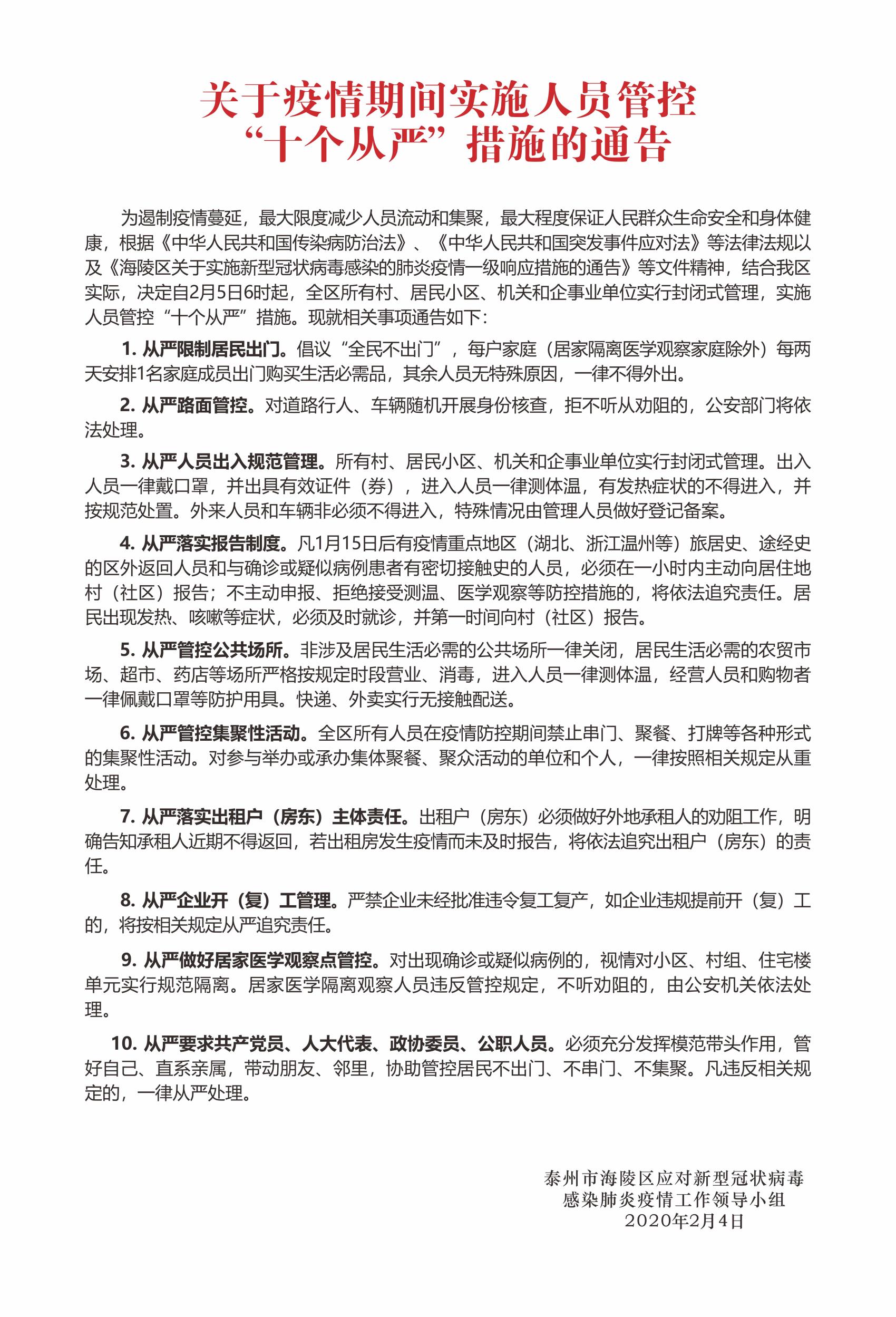 为遏制疫情蔓延,最大限度减少人员流动和集聚,最大程度保证人民群众生命安全和身体健康,根据《中华人民共和国传染病防治法》、《中华人民共和国突发事件应对法》等法律法规以及《海陵区关于实施新型冠状病毒感染的肺炎疫情一级响应措施的通告》等文件精神,结合我区实际,决定自2月5日6时起,全区所有村、居民小区、机关和企事业单位实行封闭式管理,实施人员管控“十个从严”措施。现就相关事项通告如下: