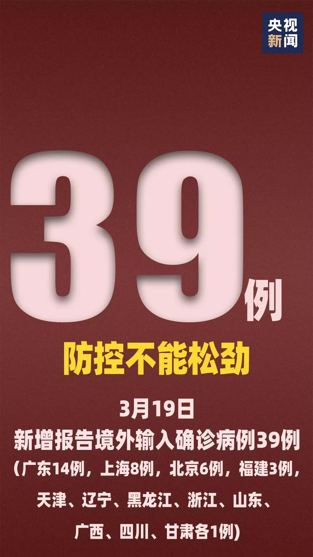 3月19日0—24时,新增报告境外输入确诊病例39例(广东14例,上海8例,北京6例,福建3例,天津、辽宁、黑龙江、浙江、山东、广西、四川、甘肃各1例)。截至3月19日24时,累计报告境外输入确诊病例228例。