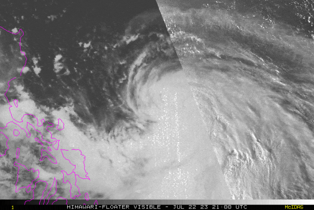 葵花-8号卫星监测到的第5号台风“杜苏芮”可见光云图动画(时间段:2023年7月23日05时00分至23日12时00分)。