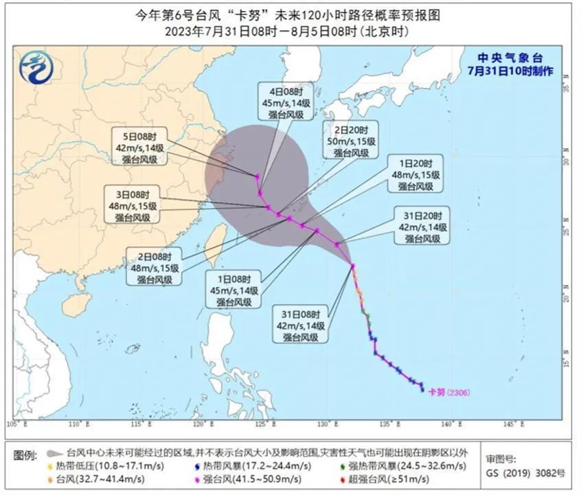 预计,“卡努”将以每小时15-20公里的速度向北偏西转西北方向移动,强度还将有所增强,最大强度可达强台风级(42-50米/秒,14-15级),8月2日夜间移入东海,逐渐转向偏北方向移动,移速明显减慢。