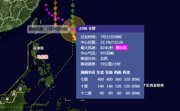 今年第6号台风“卡努”(KHANUN)已于今天(31日)上午由台风级加强为强台风级,8点钟其中心位于琉球群岛那霸市东南方向约630公里的西北太平洋洋面上,就是北纬22.1度、东经132.0度,中心附近最大风力有14级(42米/秒),中心最低气压955百帕,七级风圈半径320-400公里,十级风圈半径120-140公里,十二级风圈半径60-90公里。