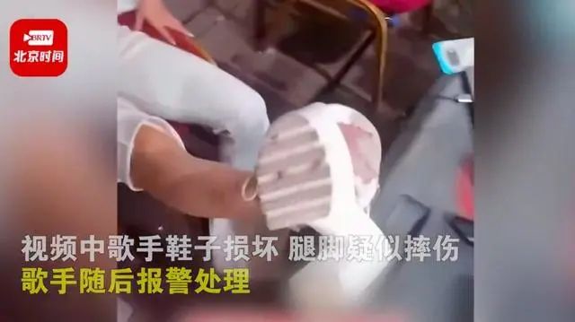 网传视频显示,一名女歌手身穿白色衣服在乡村舞台上唱歌表演,现场气氛十分热烈。当这名歌手靠近舞台边缘与观众互动时,台下有观众朝着她伸出双手。下一秒,女歌手摔倒在台上,被前排观众拉着腿拖拽到了舞台下,女歌手的高跟鞋被摔坏。