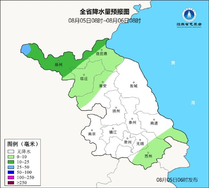 8月5日8时至8月6日8时,白天全省晴到多云,其中本省西北部和东南部部分地区有分散性阵雨或雷雨;夜里淮北地区阴有阵雨或雷雨,其中本省西北部地区