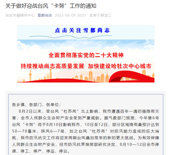 据“雪都尚志”公众号消息,黑龙江省尚志市人民政府防汛抗旱指挥部8月9日晚发布关于做好迎战台风“卡努”工作的通知,8月10-12日全市停课、停工、停产、停运、停业。
