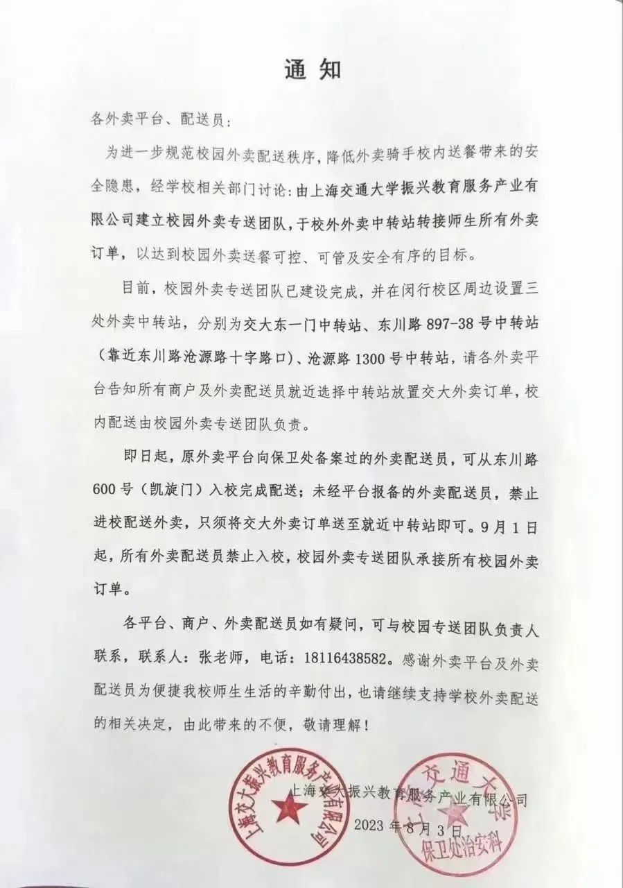 通知称,为进一步规范校园外卖配送秩序,降低外卖骑手校内送餐带来的安全隐患,由上海交通大学振兴教育服务产业有限公司建立校园外卖专送团队,于校外外卖中转站转接师生所有外卖订单。