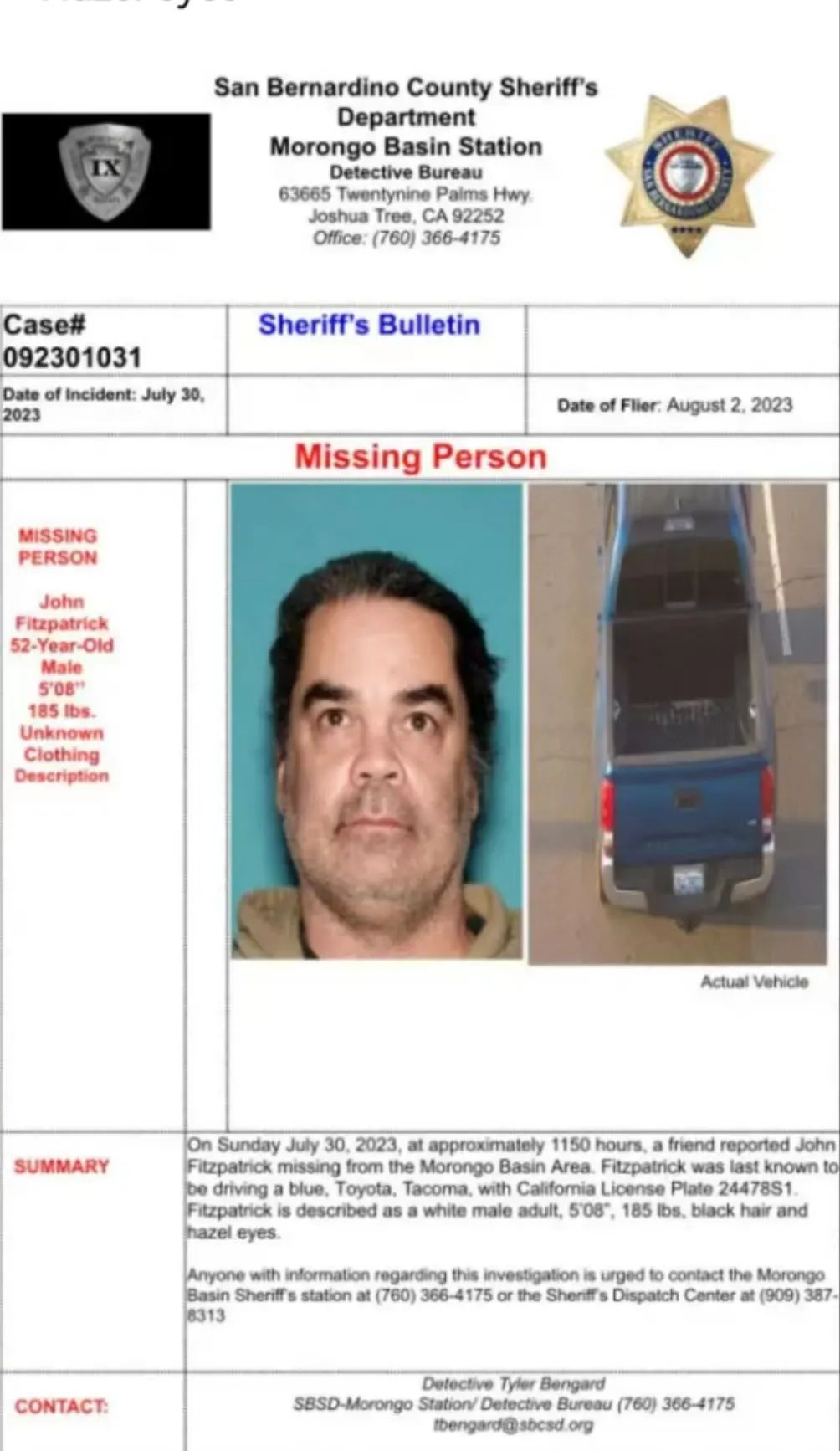 警方的失踪人员信息公示显示,约翰的朋友报警称,约翰于7月30日上午11点50分左右在莫荣戈盆地(Morongo Basin)失踪,最后被监控拍摄到的影像显示,该男子驾驶着一辆加州当地车牌的蓝色丰田塔科马中型皮卡车。