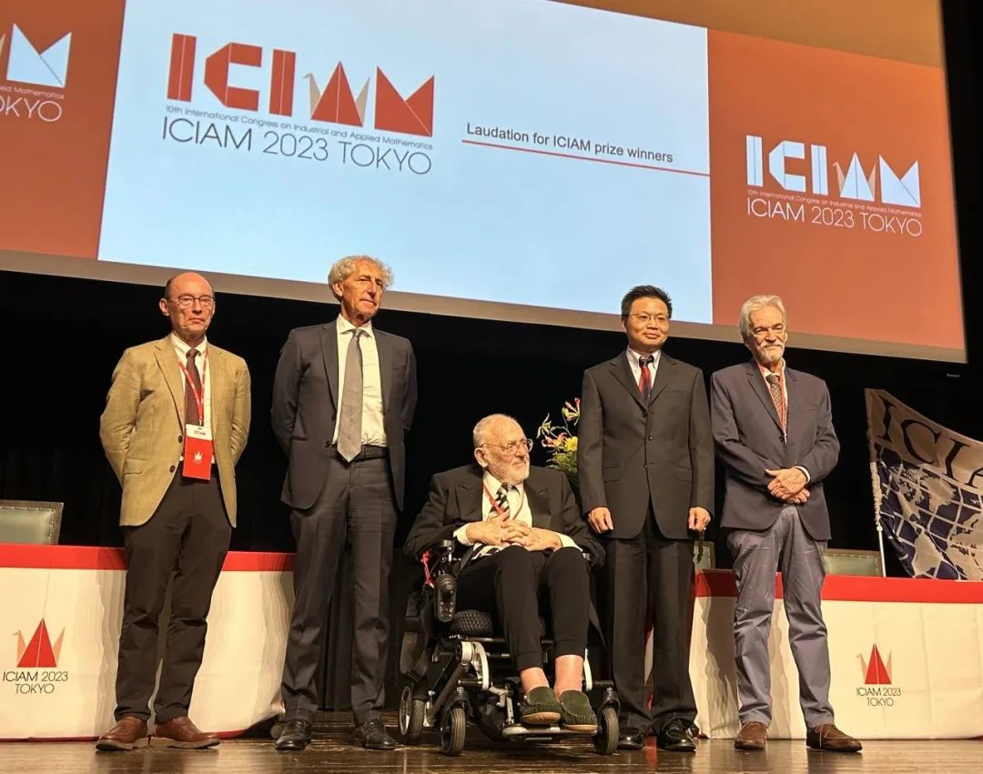 ▲鄂维南院士(右三)获得麦克斯韦奖,ICIAM主席袁亚湘院士(左三)为其颁奖