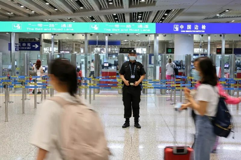 ▲8月24日,旅客从首都机场3号航站楼边检出境执勤现场前走过。暑假期间,乘机出游人群增多。新华社发