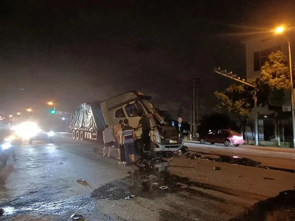 7月29日晚上9点左右,江平路靖江市火花港桥处发生一起严重交通事故,一辆向东行驶的货车与一辆半挂车