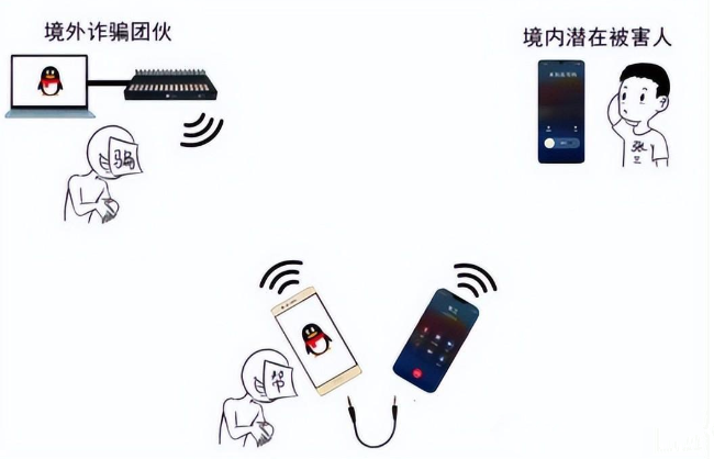 一是用两部手机,通过音频线、数据线连接或同时打开扬声器的方式实现语音中转,使得拨打出去的电话显示为本地号码。其中一部手机通过网络软件接通境外诈骗分子,另一部本地手机拨打国内受害人电话、发送短信,实现人机分离,帮助境外诈骗分子来掩饰来电真实归属地,从而更加具备隐蔽性和欺骗性。