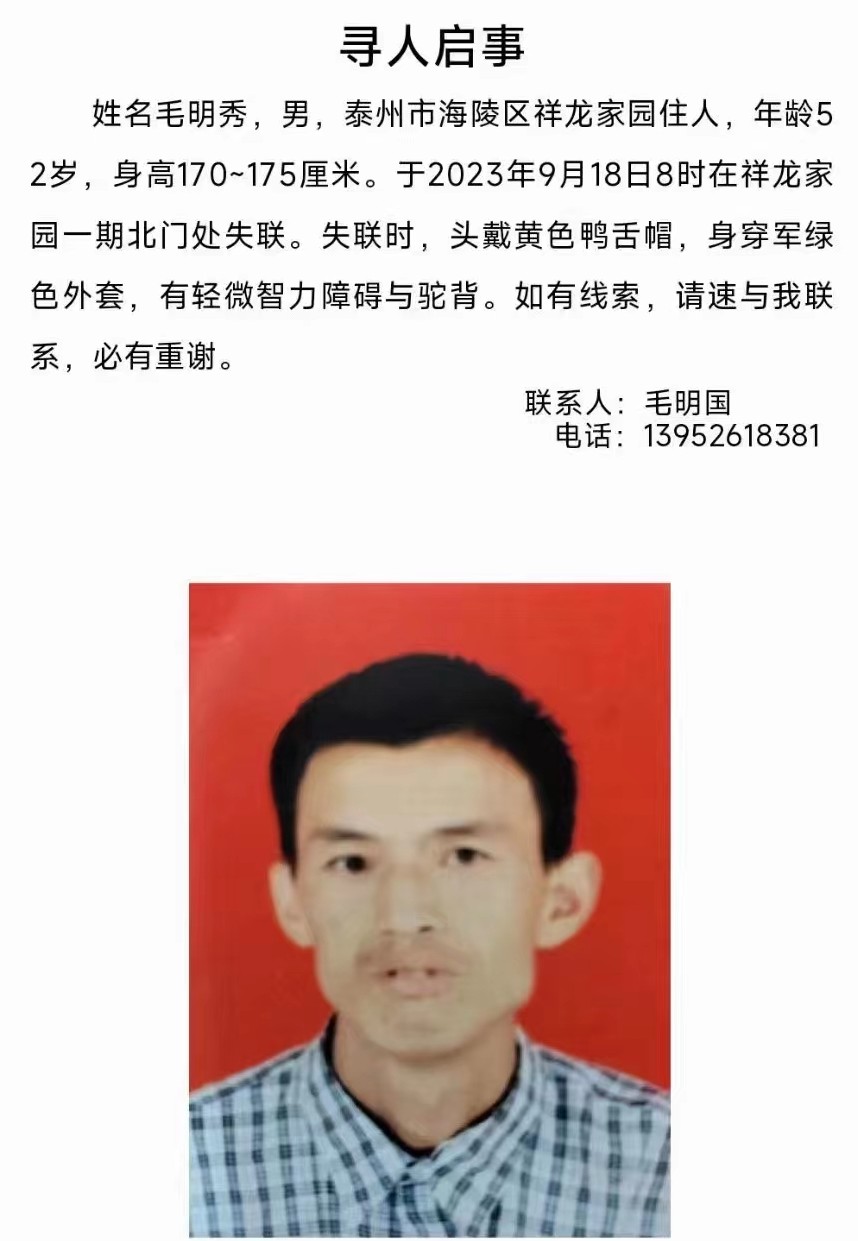 。于2023年9月18日8时在祥龙家园一期北门处失联。失联时,