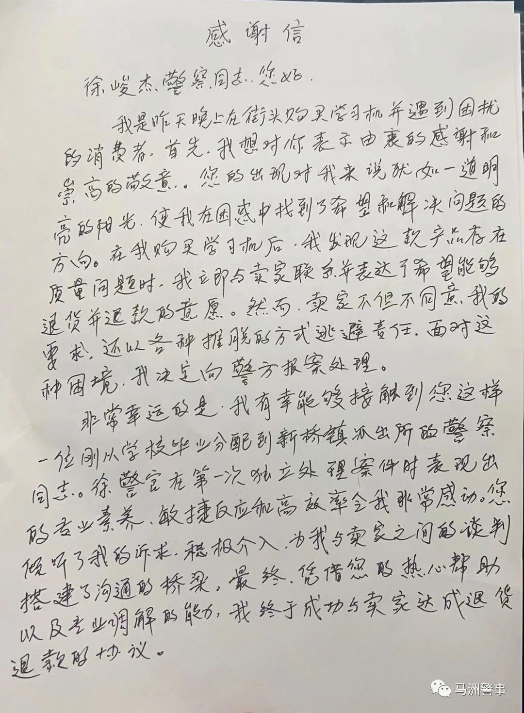 信上写着:“徐警官您倾听我的诉求,积极介入,为我与卖家之间的谈判搭建了沟通的桥梁,我在这里向您表示谢意……再次感谢您,以及所有为社会安宁默默奉献的警察同志!”