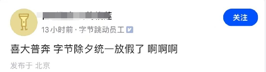 网传字节跳动宣布除夕统一放假,