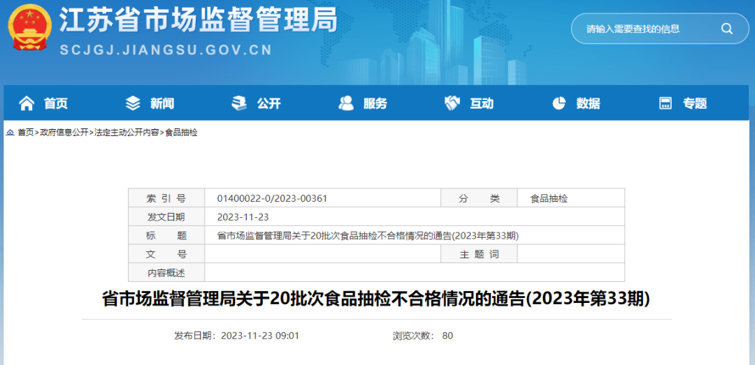 近期,江苏省市场监督管理局组织食品安全抽检,抽取食用农产品、粮食加工品、食用油、油脂及其制品、肉制品、乳制品、餐饮食品、糕点、酒类、饮料、饼干、调味品、炒货食品及坚果制品、水产制品和蔬菜制品等14大类食品885批次样品,检出其中饼干、餐饮食品、炒货食品及坚果制品、糕点、肉制品、食用农产品、蔬菜制品和水产制品等8大类食品20批次样品不合格。具体情况通告如下: