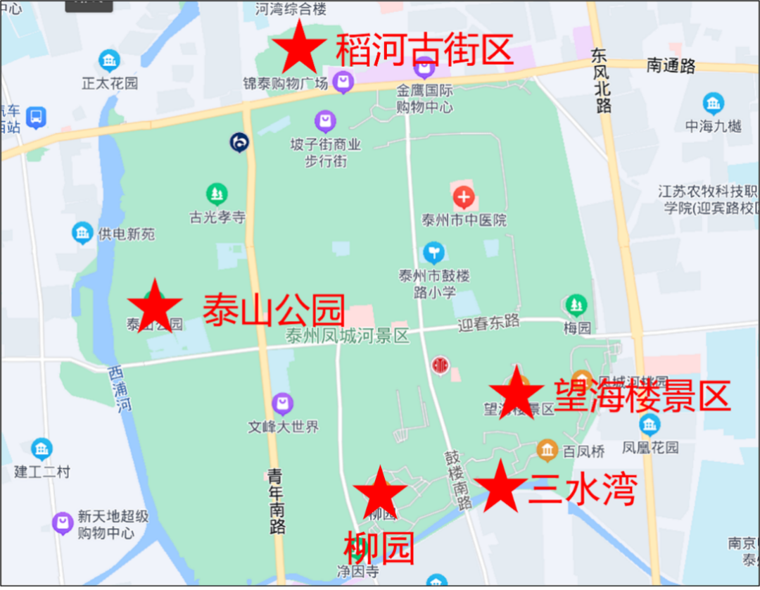 景区周边如:海陵区三水湾、泰山公园、凤城河景区、柳园、稻河古街区,姜堰区溱湖国家湿地公园、溱潼古镇旅游区,高新区天德湖公园,高港区口岸雕花楼景区等。