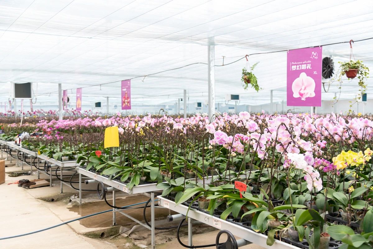 张莹介绍,蝴蝶兰基地从2022年8月开始种植,一期占地5500平方米,二期占地3800多平方米,现有成品蝴蝶兰16万株,主要有大辣椒、宝贝、黄格格等113个品种。