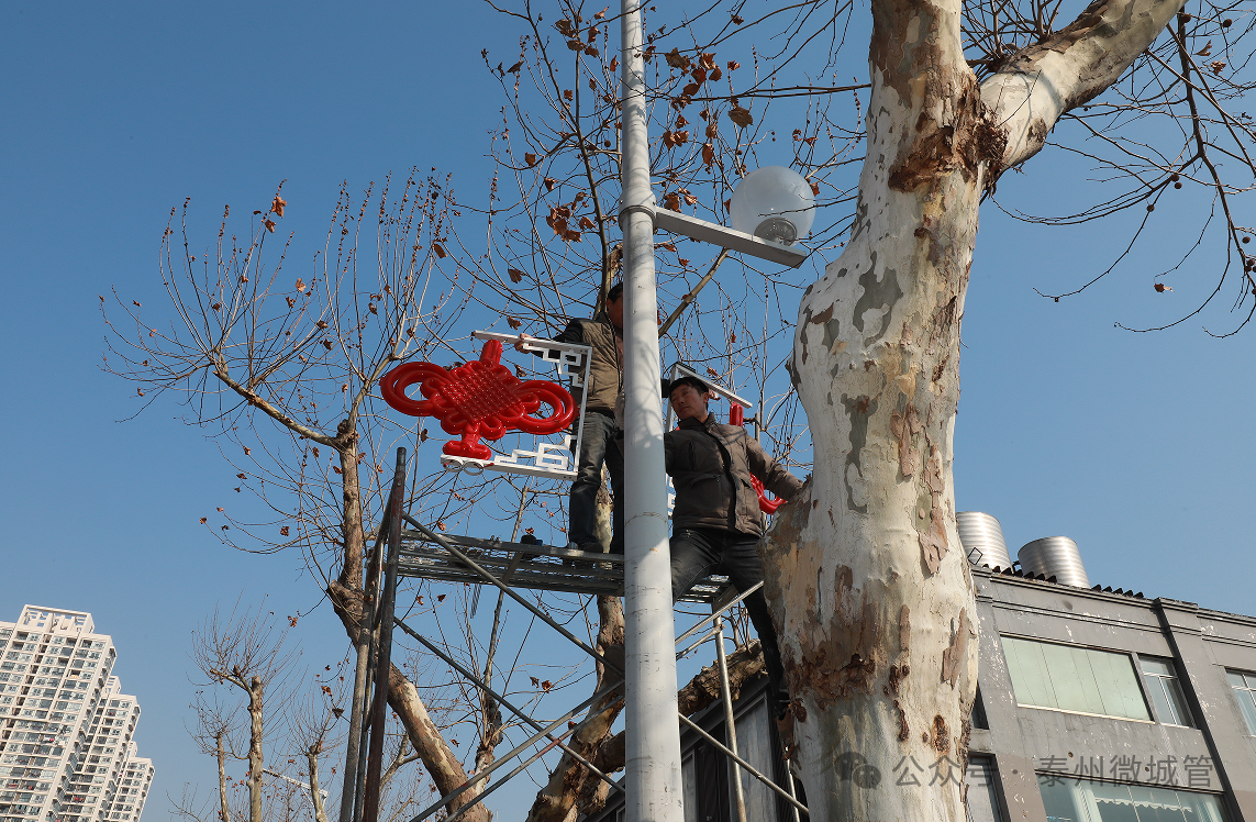 1月30日,已是中国传统的农历腊月二十,在市区鼓楼路、海陵路以及众多重要节点,施工人员正忙着悬挂灯饰设施和安装公益小品。放眼望去,悬挂完毕的路段已然换上“红装”,格外耀眼;市区人民公园行道树上已“披上”靓丽的亮化灯饰,城市到处洋溢着喜庆祥和、温馨幸福的节日气氛。