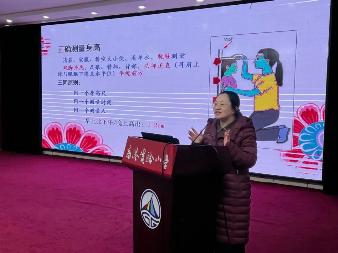 在高港实验小学阶梯教室,王主任给大家讲解了“如何正确测量身高?小朋友们身高及格了吗?小朋友们的生长速度过关吗?是什么影响了我们的身高?如何科学运动助力长高?如何合理膳食助理长高?”等知识点。