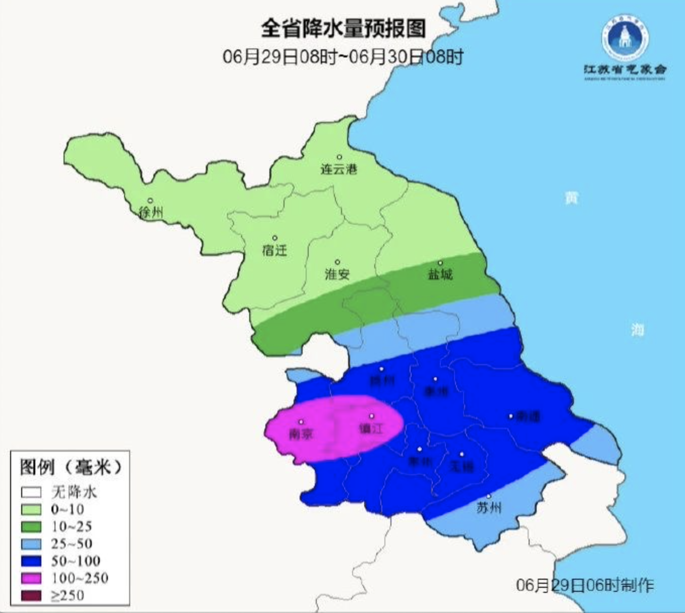 6月29日08时至6月30日08时,全省阴有阵雨或雷雨,其中江淮之间南部和沿江苏南地区大到暴雨,局部大暴雨,其他地区小到中雨。最高温度:淮北地区和苏南南部地区30~31℃,其他地区27~28℃;最低温度:沿江和苏南地区24℃左右,其他地区21~22℃。全省西南风,风力:淮河以南地区5级阵风6-7级逐渐减弱至4级左右,其他地区4—5级阵风6级,有雷雨地区雷雨时短时阵风8—10级。