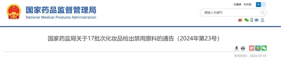 关于17批次化妆品检出禁用原料的通告