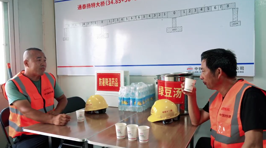这个“炎”值爆表的夏天,不服“暑”的你们!辛苦了~您在战高温,我来送清凉,一起守护这座城。市交通部门在北沿江高铁施工现场配备了工人休息室,贴心准备了防暑降温药品、饮用水、绿豆汤等。