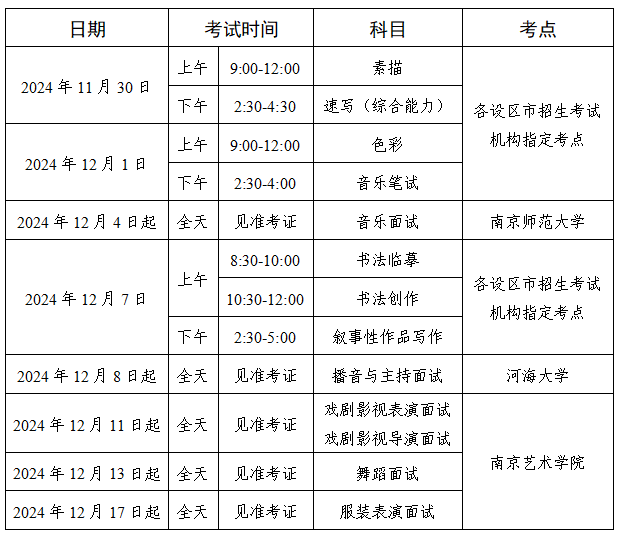 省统考自2024年11月30日开始,面试科目考试由有关高校组织实施,其中音乐类面试考点设在南京师范大学,舞蹈类、表(导)演类面试考点设在南京艺术学院,播音与主持类面试考点设在河海大学。
