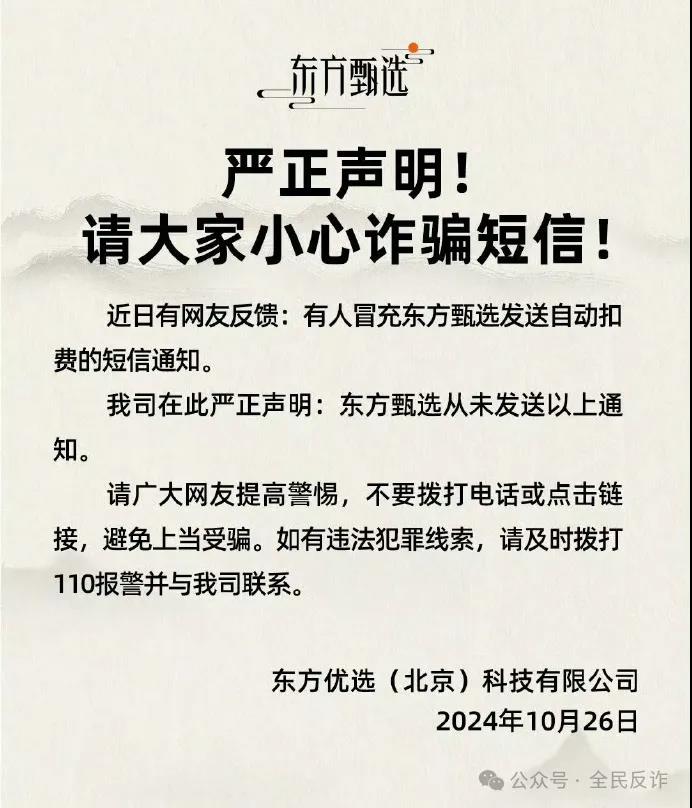 近日有网友反馈:有人冒充东方甄选发送自动扣费的短信通知。我司在此严正声明:东方甄选从未发送以上通知。请广大网友提高警惕,不要拨打电话或点击链接,避免上当受骗。如有违法犯罪线索,请及时拨打110报警并与我司联系。