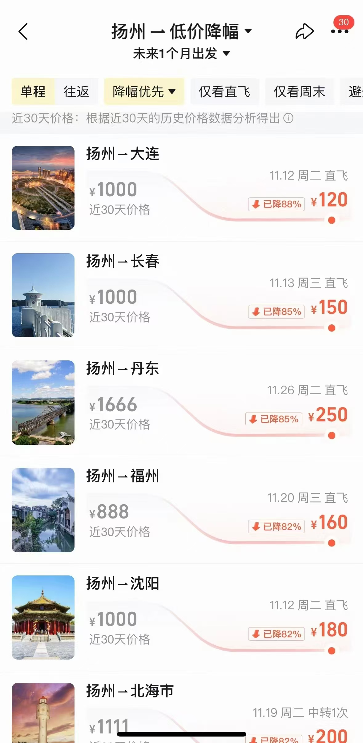 查询某购票平台发现,从扬州泰州机场出发至多个城市的价格均出现大跳水。其中,11月12日扬州飞大连降幅达88%,最低120元,从扬州飞往厦门、海口等热门旅游城市的往返机票也不超过500元。