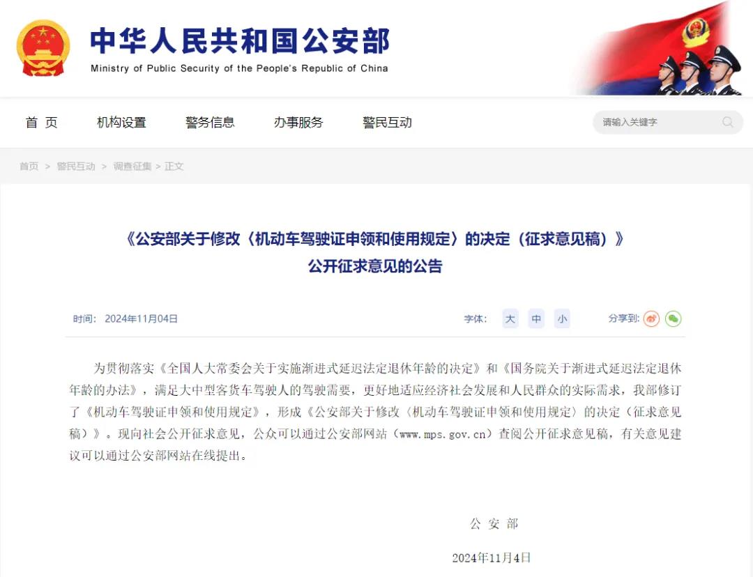 为贯彻落实《全国人大常委会关于实施渐进式延迟法定退休年龄的决定》和《国务院关于渐进式延迟法定退休年龄的办法》,满足大中型客货车驾驶人的驾驶需要,更好地适应经济社会发展和人民群众的实际需求,我部修订了《机动车驾驶证申领和使用规定》,形成《公安部关于修改〈机动车驾驶证申领和使用规定〉的决定(征求意见稿)》。现向社会公开征求意见,公众可以通过公安部网站(www.mps.gov.cn)查阅公开征求意见稿,有关意见建议可以通过公安部网站在线提出。