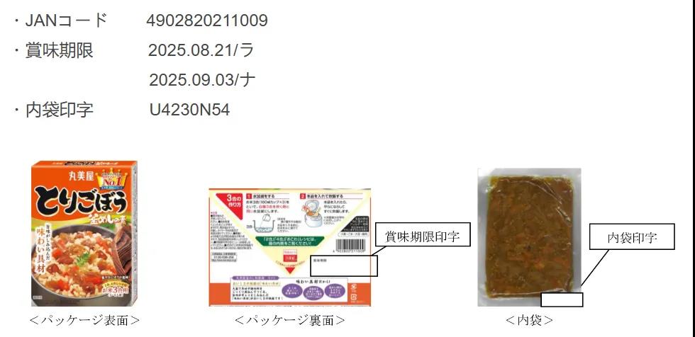 主动召回的产品为丸宫食品株式会社在新泻县工厂生产、在全国销售的“Tori Burdock Kamameshi no Mix”,保质期为2025年8月21日至2025年9月3日。该产品的编号为“U4230N54”印在内袋上。
