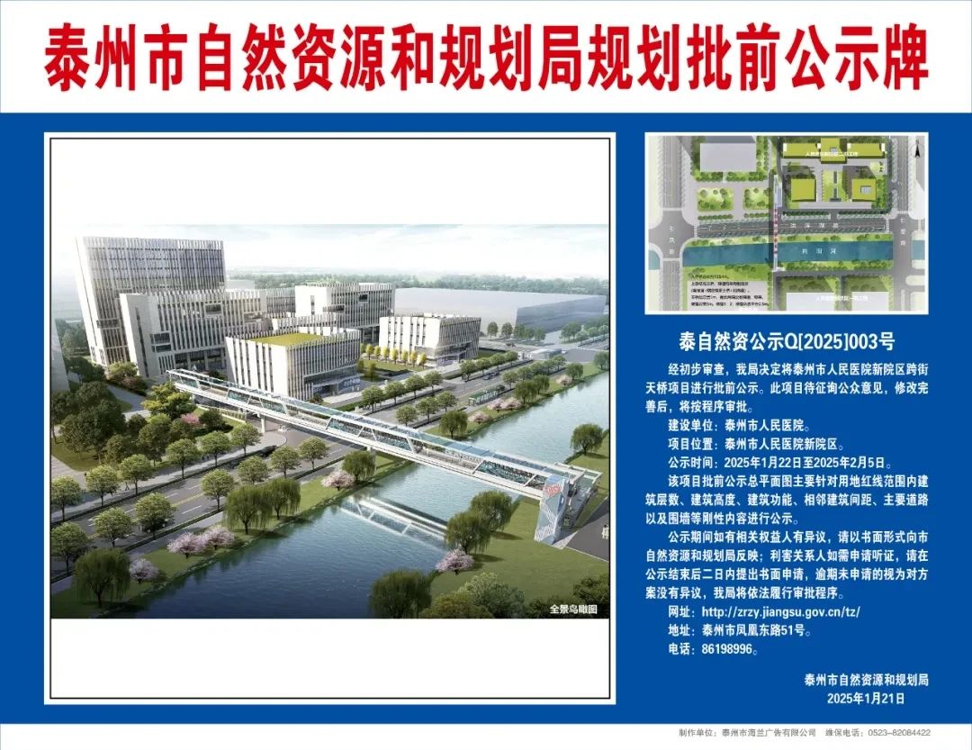 经初步审查,我局决定将泰州市人民医院新院区跨街天桥项目进行批前公示。此项目待征询公众意见,修改完善后,将按程序审批。