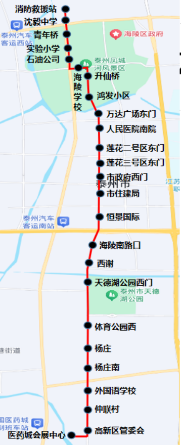 停靠站点:消防救援站、沈毅中学、青年桥、实验小学、石油公司、海陵学校、升仙桥、鸿发小区、万达广场东门、人民医院南院、莲花二号区东门、莲花三号区东门、市政府西门、市住建局、恒景国际、海陵南路口、西谢、天德湖公园西门、体育公园西、杨庄、杨庄南、外国语学校、仲联村、高新区管委会;