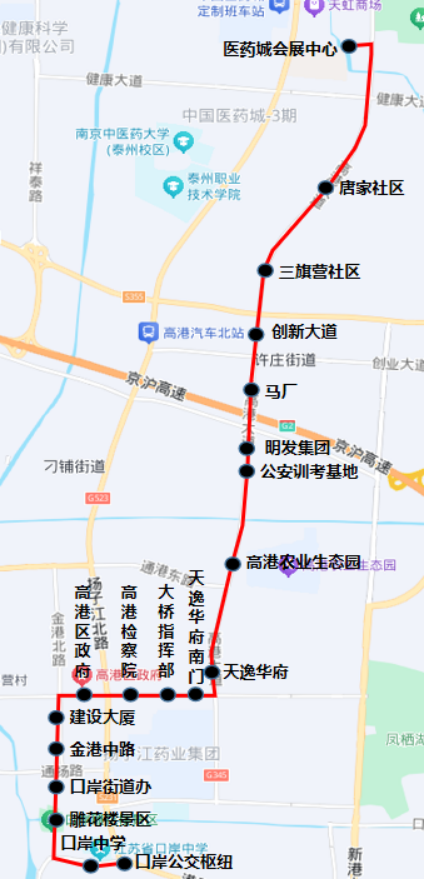 线路走向:由金润广场(客运西站)始发,经东进路-鼓楼路-药城大道-海陵路-郁金路至医药城会展中心;
