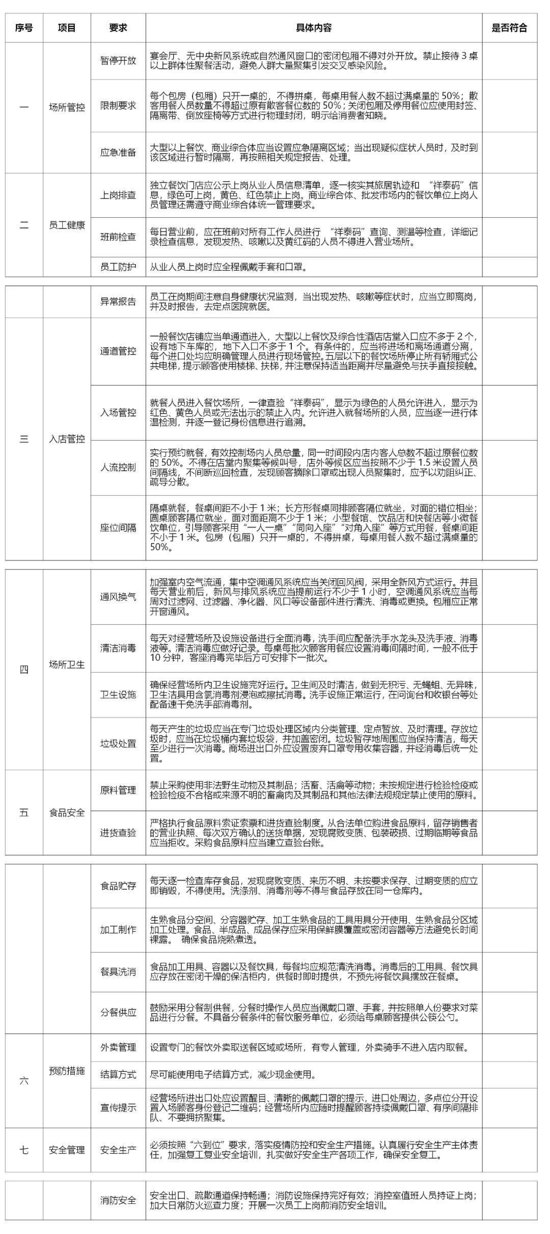 各餐饮业市场经营主体法定代表人为疫情防控和安全生产第一责任人。要在本单位醒目位置公示所有上岗员工轨迹核查结果和“祥泰码”情况、防控措施以及顾客用餐须知,在入口处、收银台等处设置1米间隔线。食品加工制作和餐厨垃圾管理要符合《餐饮服务食品安全操作规范》等相关规定。制定完善好疫情防控应急预案。