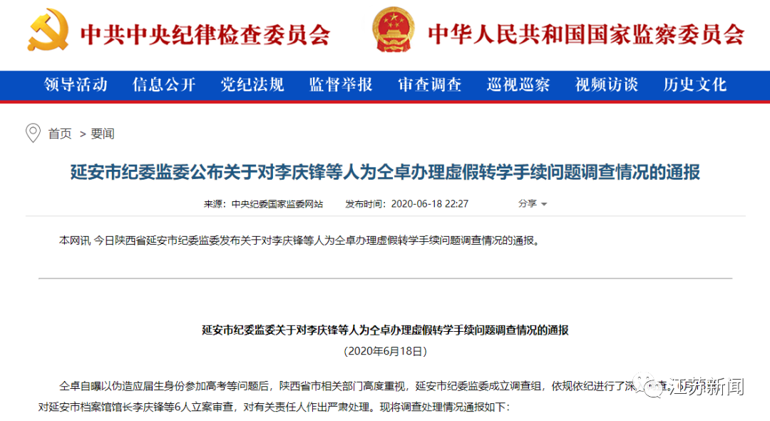 18日晚上10点27分,中央纪委国家监委网站发布了“延安市纪委监委公布关于对李庆锋等人为仝卓办理虚假转学手续问题调查情况的通报”。