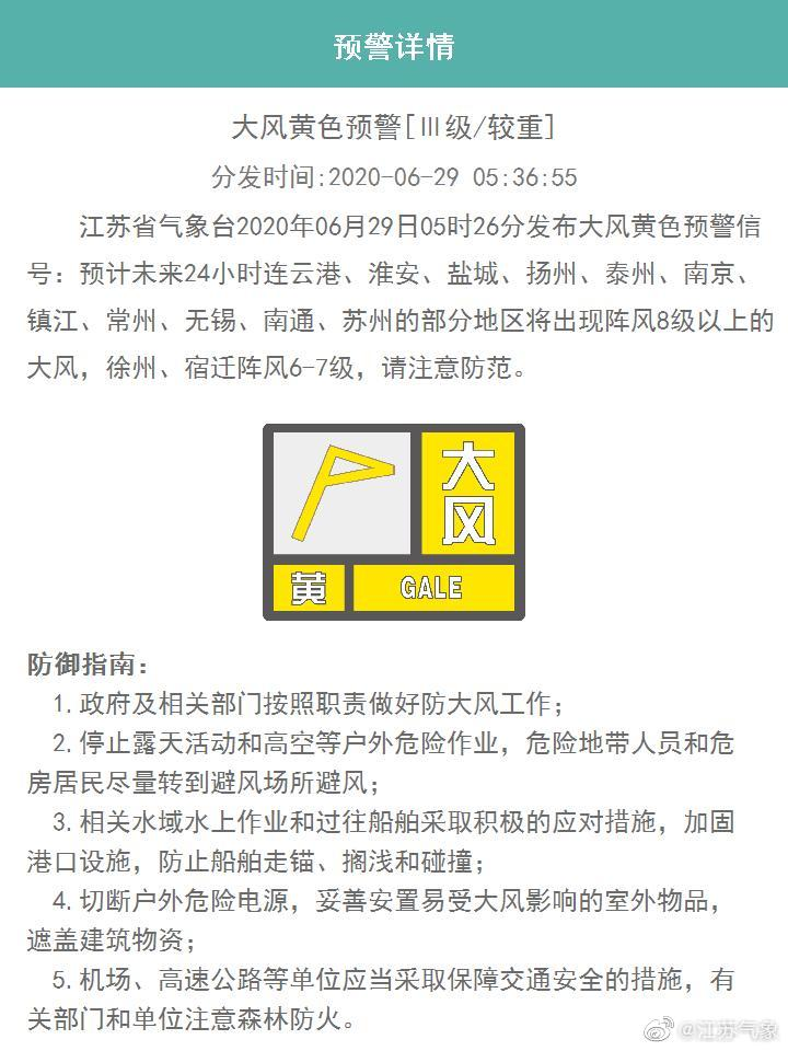 江苏省气象台 6月29日5时26分 发布大风黄色预警信号