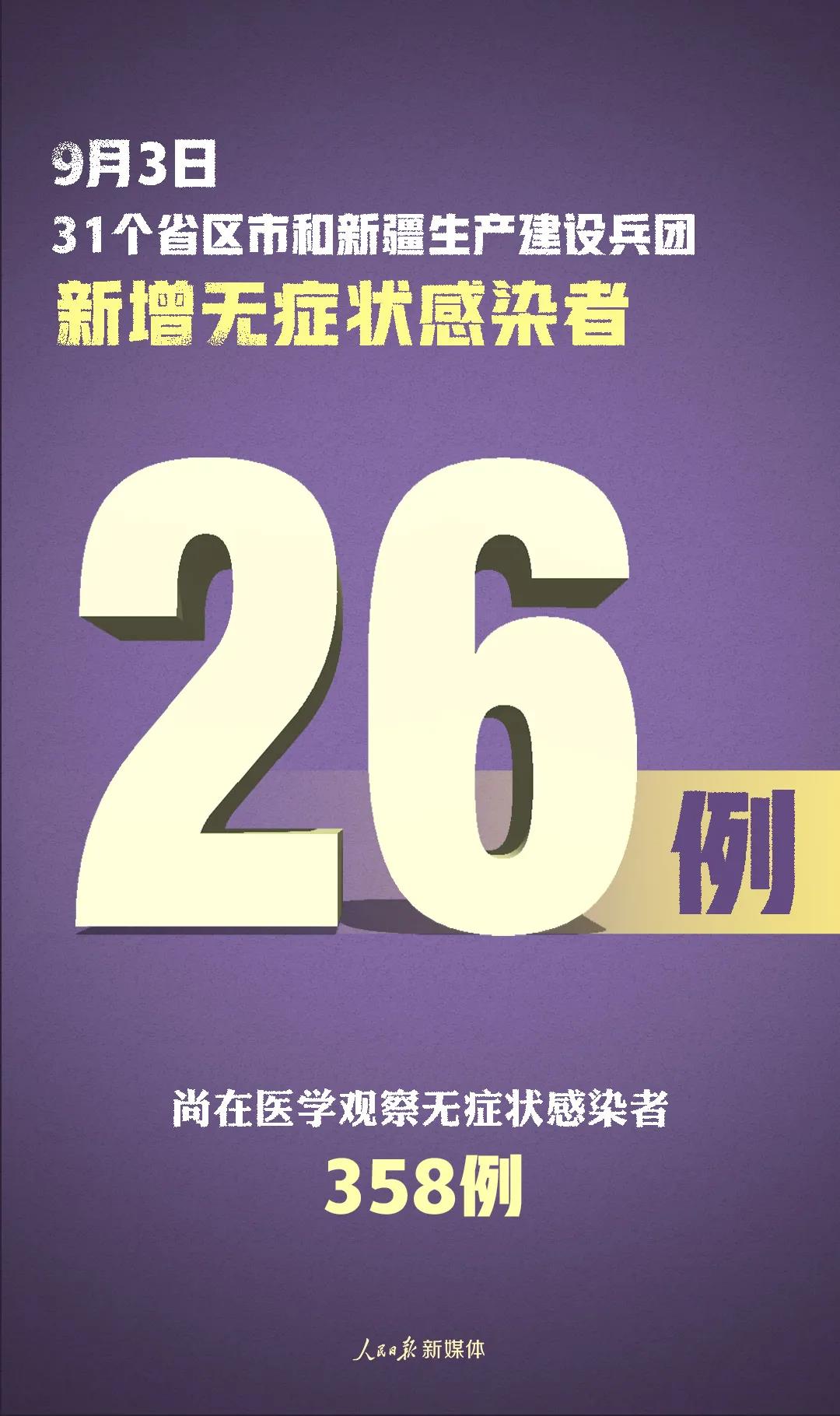 31个省(自治区、直辖市)和新疆生产建设兵团报告新增无症状感染者26例(均为境外输入);当日转为确诊病例2例(均为境外输入);当日解除医学观察15例(境外输入13例);尚在医学观察无症状感染者358例(境外输入345例)。