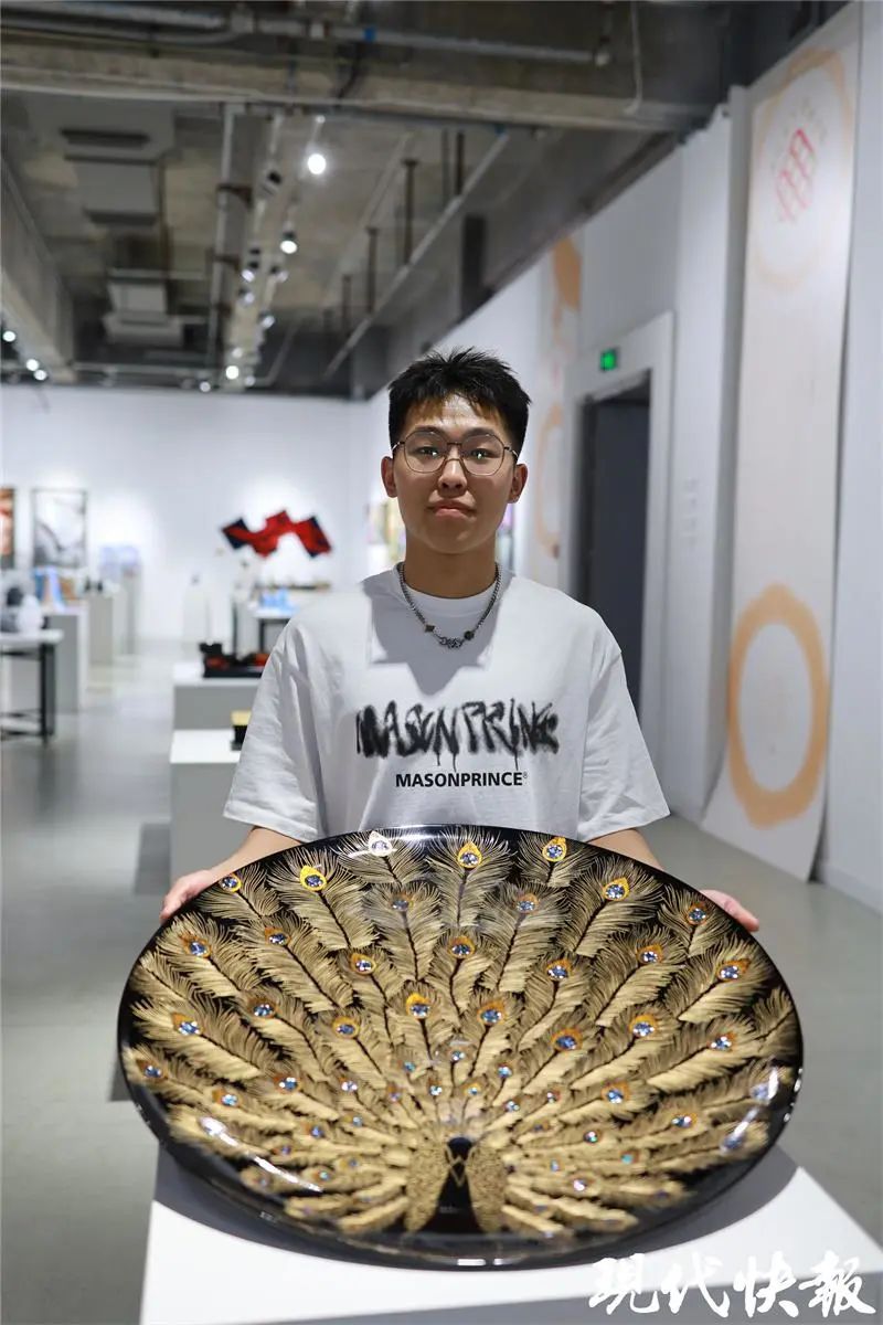 李文龙,2000年3月出生,山东潍坊人,2022届山东工艺美术学院漆艺专业应届毕业生。直径70厘米的漆盘中间,一只栩栩如生的开屏孔雀,正昂首挺胸,尽情展示着自己五彩缤纷的尾羽。定睛细瞧,每一根羽毛都遒劲有力,感觉随时都可能走出漆盘……这就是李文龙耗时5个多月完成的毕业设计——《孔雀屏深扇影开》。