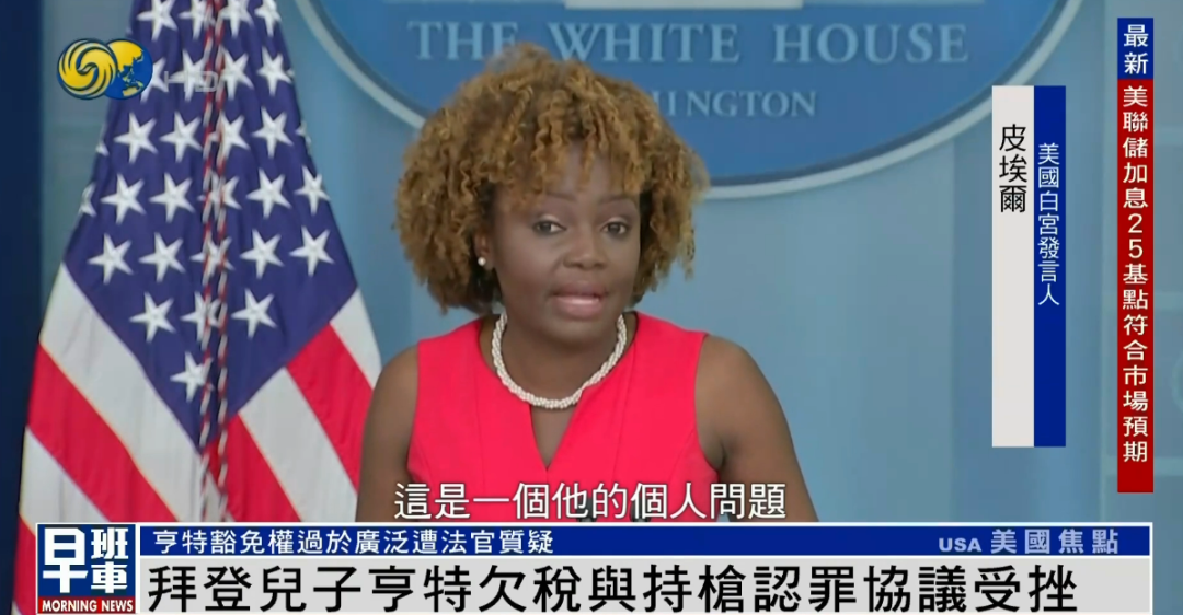 白宫发言人 皮埃尔:亨特是一名普通公民,这是他的个人问题。正如我们所说,总统、第一夫人爱他们的儿子,支持他继续重建自己的生活。众所周知,此案是由司法部在前总统特朗普任命的检察官领导下独立处理的。