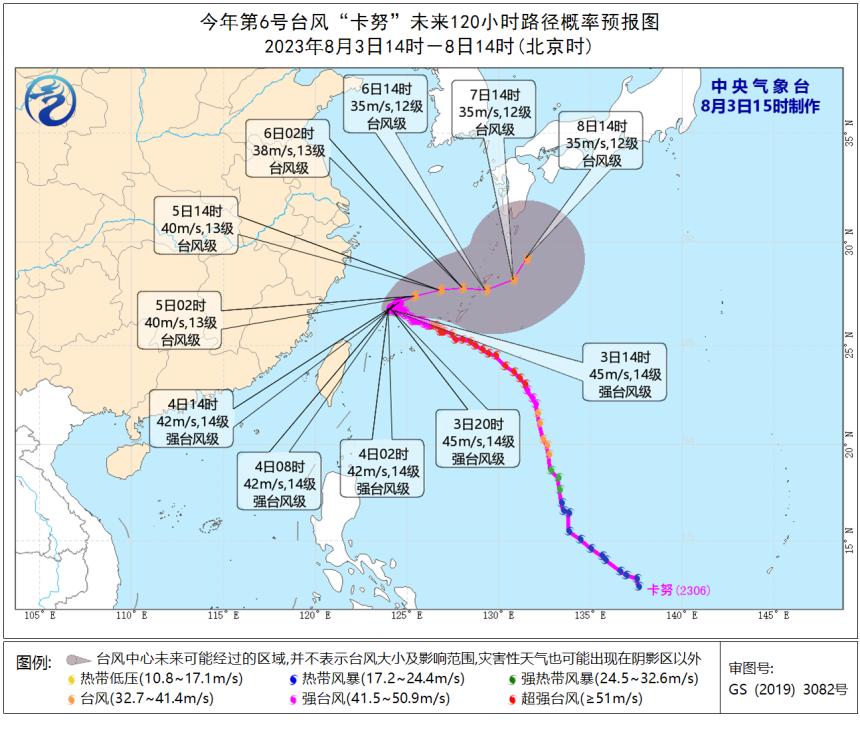 今年第6号台风“卡努”(KHANUN)(强台风级)的中心今天(3日)下午14点钟位于北纬26.7度、东经124.3度,中心附近最大风力有14级(45米/秒),中心最低气压为950百帕。