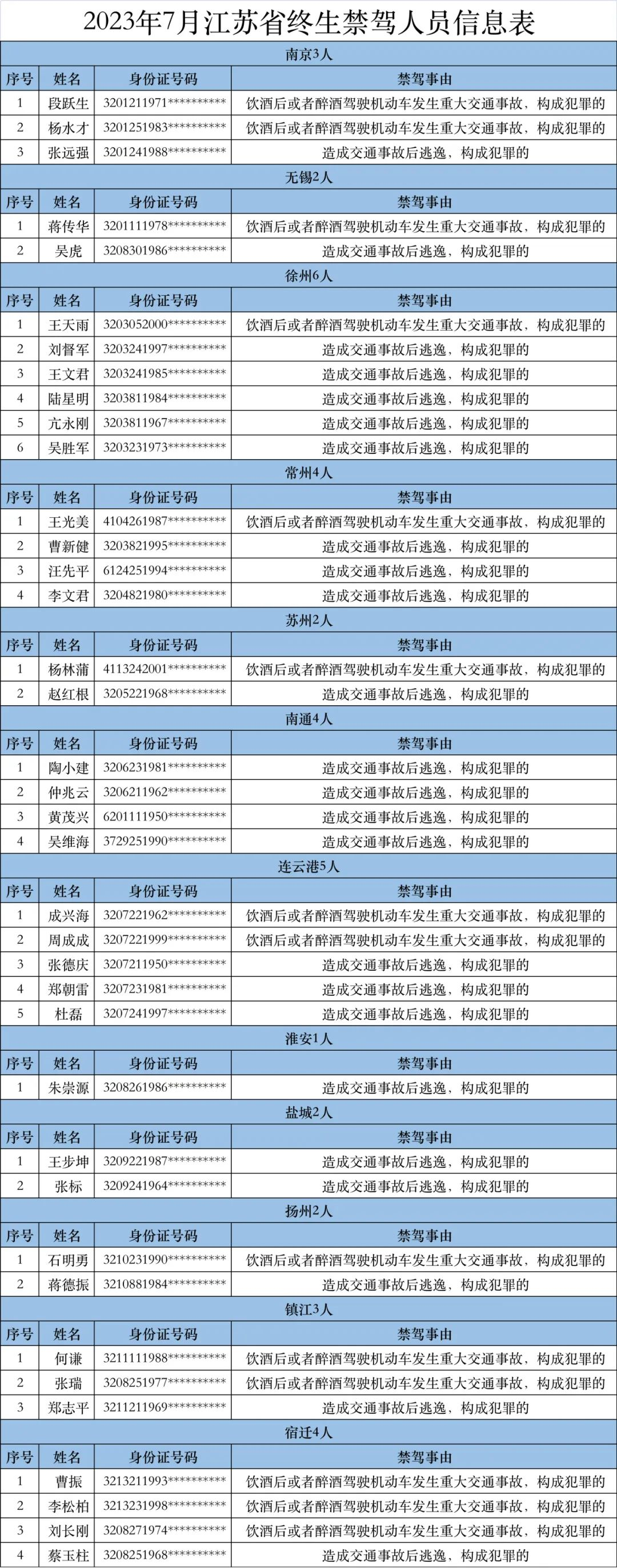 为深入开展道路交通安全夏季整治行动,全力以赴防风险除隐患、保安全保畅通,努力以高水平安全保障高质量发展。今年以来,江苏交警持续开展“五大曝光”行动,加大对严重交通违法犯罪行为的曝光力度,充分发挥教育引导、警示震慑作用。据统计,2023年7月,全省共计38人被依法吊销机动车驾驶证,且终生不得重新申领。现将名单予以曝光。