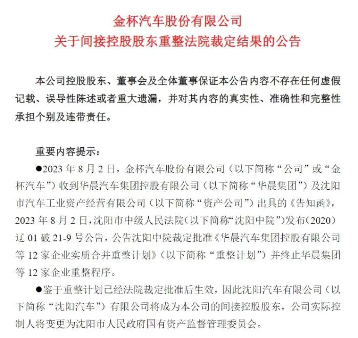 这也意味着,经历多次调整修改后,华晨集团的重整方案终于获批。 华晨集团是隶属于辽宁省国资委的重点国有企业,旗下拥有华晨中国、金杯汽车、申华控股等上市公司。2020年8月,华晨集团旗下多只存续债券出现暴跌,此后华晨集团陷入债务危机。 2020年11月,在被曝出多笔违约、无法按时清偿债务后,经债权人申请,沈阳中院裁定受理华晨集团重整案件。次年3月份,华晨集团等12家企业进行实质合并重整。多次延期后,直到2023年6月14日,沈阳汽车与华晨集团等12家企业、管理人共同签署了《华晨汽车集团控股有限公司等12家企业实质合并重整之投资协议》。 上述协议显示,沈阳汽车拟作为总投资人,以取得华晨集团100%股权的方式整体承接华晨集团等12家实质合并重整企业资产(华晨中国0.44%的股权,华晨集团持有的、全部质押给债权人的广发银行股份有限公司股权及相应孳息,以及其他破产重整程序中依法已/拟通过拍卖或其他方式处置的资产除外),包括核心资产华晨中国、金杯汽车、申华控股三家上市公司的控制权及其他非上市资产,以及附件一清单所列示的融资租赁物。 此次华晨重整计划获批,也意味着华晨系将翻开新的一页。