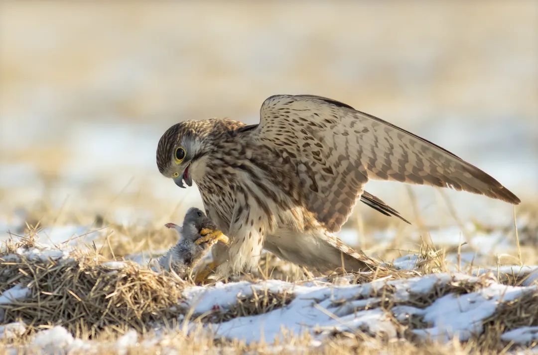 一场大雪过后,泰州“鸟人”王学辉拍摄的红隼,记录于天德湖东侧