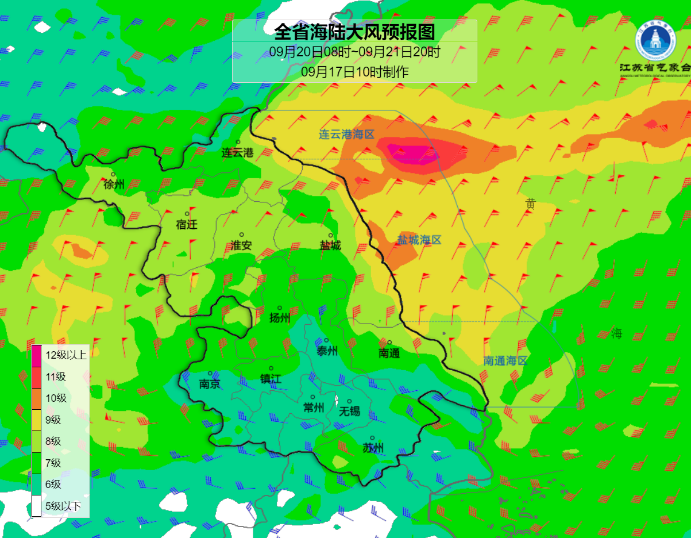 20日至21日白天陆上最大风力:沿江及以北地区7~8级,其他地区5~6级,水上最大风力,连云港和盐城海区10~11级,南通海区和江河湖库7~9级。