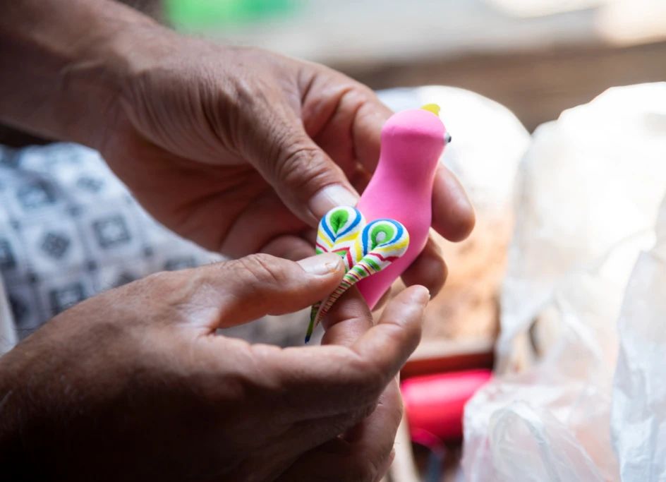 “喜欢小鸟吗?做个给你瞧瞧。”说着,他抽出工具箱的抽屉,揪下一块面团,辅以简单的工具,几经捏、搓、揉、掀,用小竹刀灵巧地点、切、刻、划,不到5分钟,一只小鸟便脱手而成,在阳光的照耀下,栩栩如生。