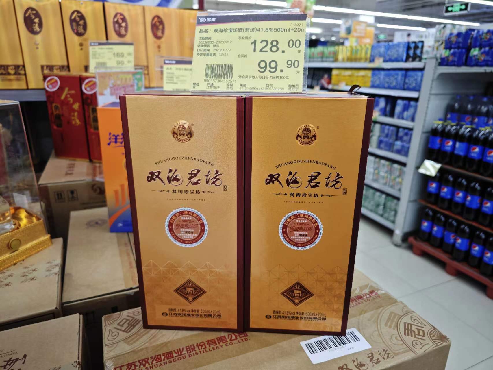 在青年路上的苏果超市,这款双沟酒恰巧在进行会员促销,非会员价128元一瓶,会员价99.9元一瓶,记者的实际购买价格是99.9元一瓶