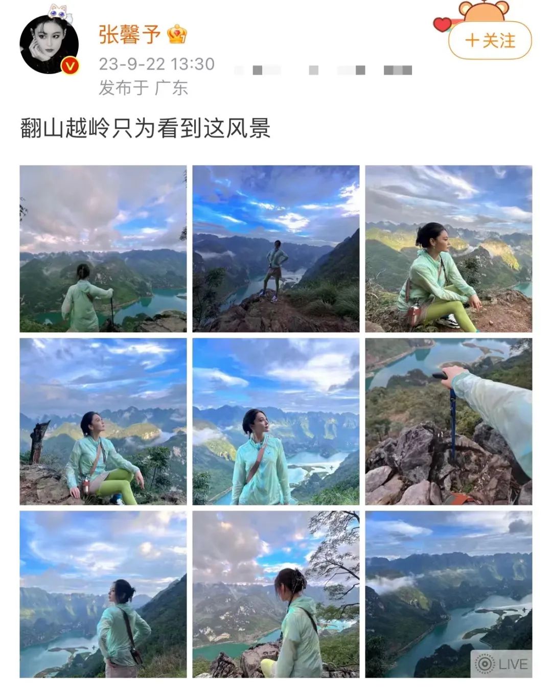 在#广西一座山因张馨予打卡成网红#登上热搜后,张馨予本人也在微博发布提醒:“希望大家游玩的同时一定要注意安全啊,因为我去的那个山头其实还挺危险的,没有任何保护措施。”