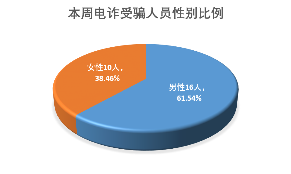 从受骗人员性别看,男性16人,女性10人。从受骗人员年龄看,20岁以下2人,占比7.69%,20-30岁13人,占比50%,30-40岁4人,占比15.38%,40-50岁4人,占比15.38%,50岁以上3人,占比11.54%。