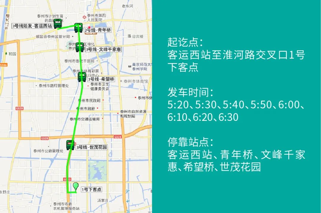 泰州体育公园北门(起点)—海军东路—鼓楼南路—静安路—桃园路—迎春东路—人民东路—人民西路—南园路—静安路—海陵南路—周山河路(折返)—海陵南路—海军东路—泰州体育公园体育场(终点)