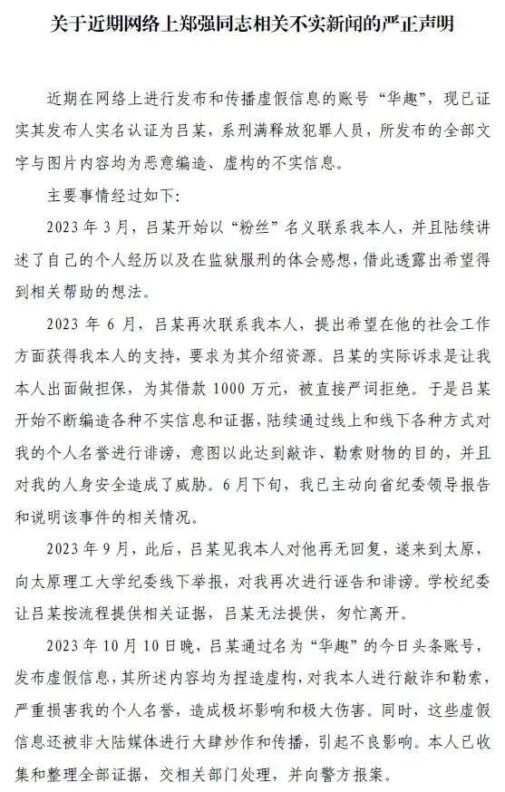 10月12日中午,郑强教授通过微信公号发布声明:近期在网络上进行发布和传播虚假信息的账号“华趣”,现已证实其发布人实名认证为吕某,系刑满释放犯罪人员,所发布的全部文字与图片内容均为恶意编造、虚构的不实信息。